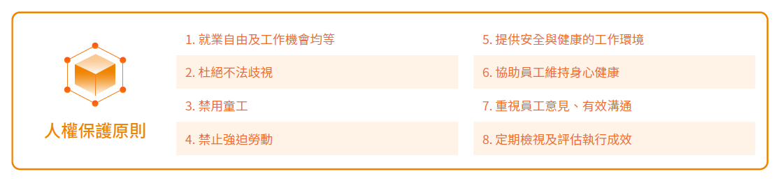 在政策面,仲琦科技制訂員工手冊、工作規則、招募任用、性騷擾防治、反對職場霸凌等內部管理辦法,仲琦越南也有成立工會組織及簽訂團體契約,明確宣示保護員工權利,確保同仁獲得妥善照顧。主要包括以下人權保護原則: