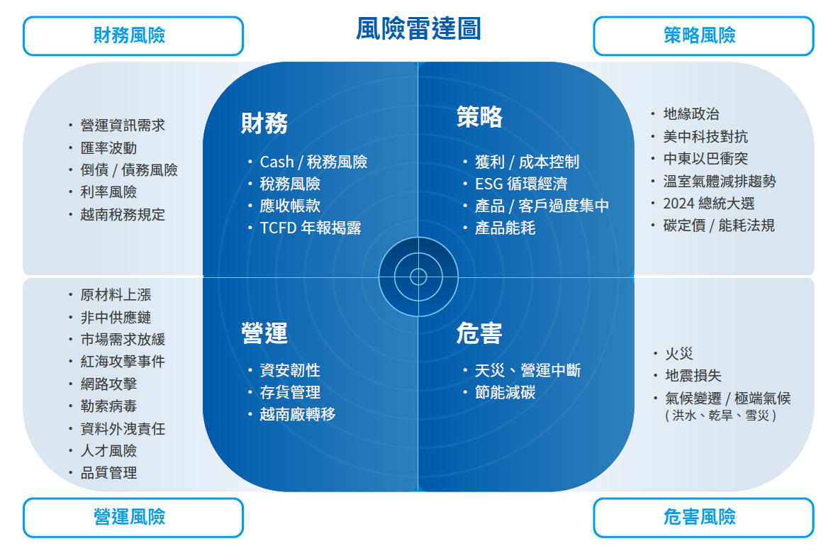 - 制定年度公司層級重大風險:依照策略、財務、營運及危害四大風險類別彙整,並由總經理彙整出三大風險:策略風險、財務風險及營運風險。