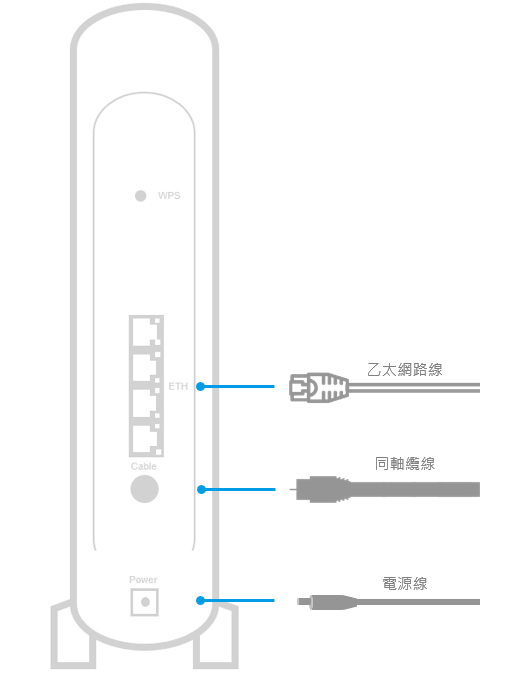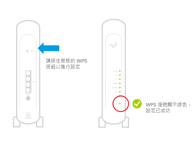纜線數據機/路由器背板上方有 WPS 功能按鍵,請長按 5 秒以執行 WPS 配對功能。亦可透過網路管理介面 WPS > Push Button 執行。
